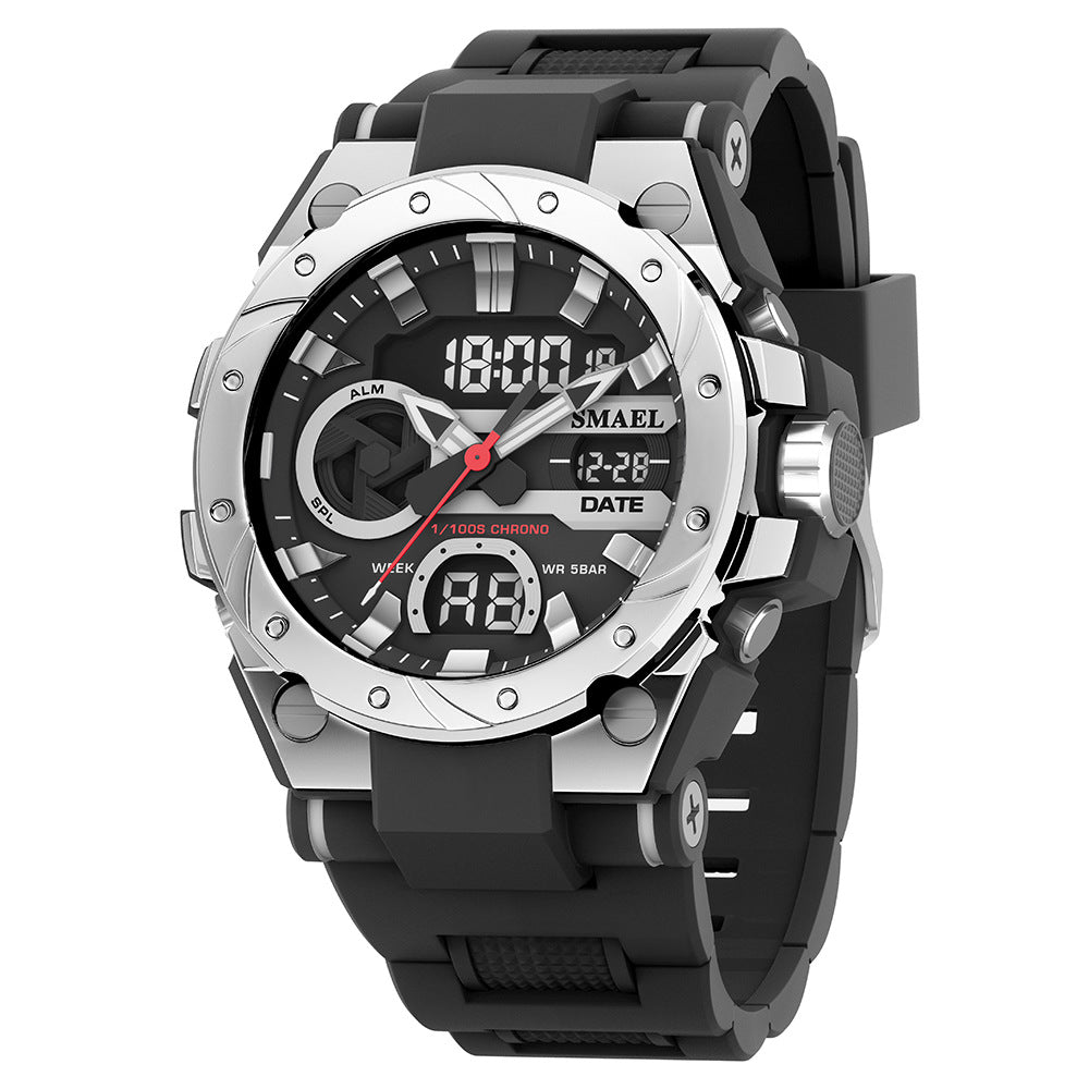 Men's Sport Watch Male Dual Time Watch LED Light Watch Alarm Fashion Sport Watch Military Watch, Silver
